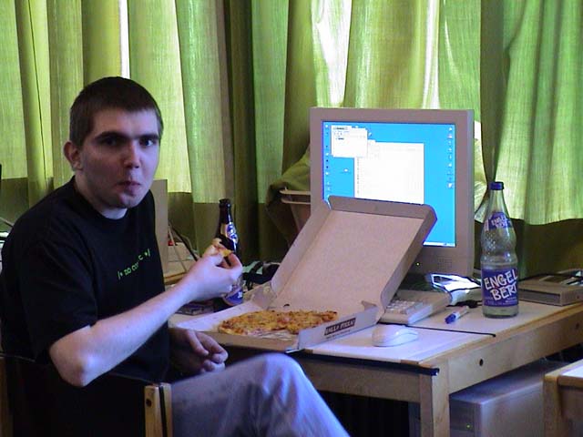 For lunch we got the usua l- what else but pizza??? Then Bernd gave us a presentation on BeOS NG. There was very recently an announcement by YellowTab (the company that Bernd runs) that they had lost their financial backing and had to abandon the project. However, there was so much work put into BeOS NG that it's going to be finished off and sold for 49 Euros a pop. Bernd is also in discussion with the OpenBeOS and Blue OS guys.
