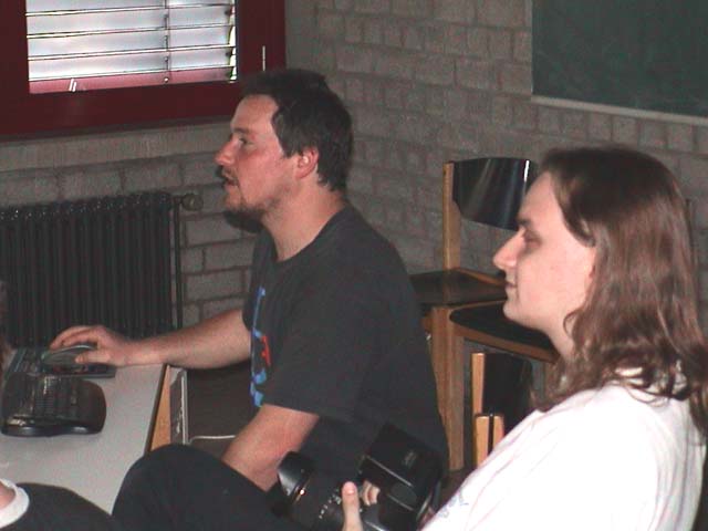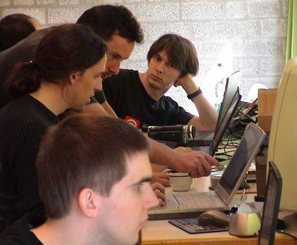 The event consisted mainly of people sitting around chatting and using their PCs. There were a few DVDs being played, cokes being drunk and even some coding - Marcus Overhagen was working on the OpenBeOS Media Kit. Many pictures and videos were taken, You'd wonder if it was a Sony user group with the number of cameras and Sony laptops around. There was even a "Future BeOS" meeting - several people had PalmsOS PDAs... Palms always appear at BeOS events and IIRC ex-Be Fearless leader JLG was in charge of the Apple Newton project and may have been involved with Palm at one point.