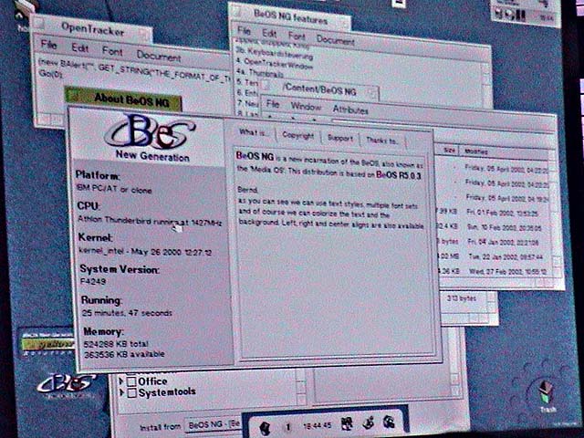 The talk was instead of OpenBeOS (OBOS) and what they are planning. There is apparently a 2 stage process where the first is to create a BeOS replacement. Some nasty bugs have apparently been found in the BeOS and these are not being duplicated! They have also put in things like mmap which BeOS never had but many unix programs (i.e. MySQL) need. That said given the resources Be had they did an excellent job, so some bugs were only to be expected. MS with 100 times more engineers and massive profits have yet to produce and OS even close to BeOS. Er, rant over...