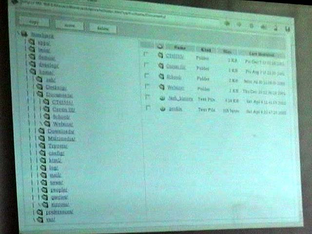 Mark Hellegers gave a demo of his FileDisk program which allows web based control of files on a BeOS system. You could do this with other systems but this allows you to access all of the attributes which BFS gives you. He couldn't really demo it properly as his presentation was given from a 32MB laptop which wont run Mozilla. It doesn't work properly with Net+ (not much does these days) but we could see the general idea as it could produce the displays.