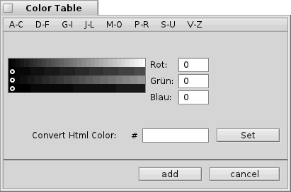 Über die Farbtabelle kann man RGB (Rot, Grün, Blau) Farben in den Programmkode einfügen. Dazu kann man auf über 100 vordefinierte Farben zurückgreifen. Es gibt auch eine klassische Farbauswahl, sowie eine Möglichkeit eine HTML Farbe zu konvertieren.