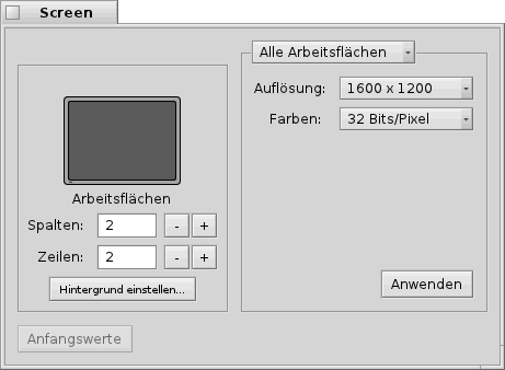 Wie sicherlich allen bekannt sein dürfte, lassen sich die EInstellungen für den Bildschirm (Auflösung, Bildwiederholfrequenz, etc.) recht komfortabel über "Preferences / Screen" ändern.
