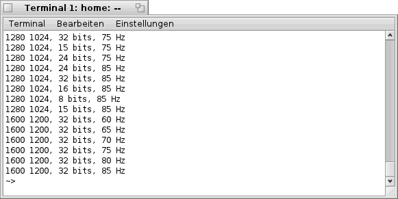 Beim Aufruf des Programms "screenmode" mit dem optionalen Parameter "-l" erhält man eine Liste mit allen verfügbaren Bildschirmmodi. Die Liste sieht dabei in etwa so aus: