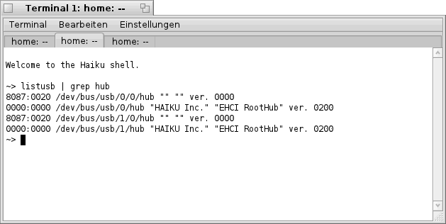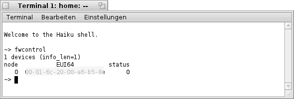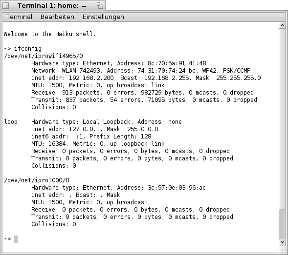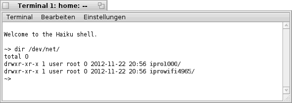 im "Terminal" bekommt man die folgende bzw. eine ähnliche Liste zu sehen. Hier sind, wie bereits oben erwähnt, alle Netzwerk- Karten welche Haiku erkannt hat aufgelistet (siehe Bild).