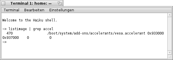 Das Zauberwort heißt in diesem Fall "listimage", und damit die Ausgabe nicht zu lang wird, filtern wir diese mit "grep accel". In der ausgegebenen Zeile läßt sich dann der aktuell geladene Grafik- Treiber ablesen. In diesem Beispiel ist es der "vesa.accelerant".
