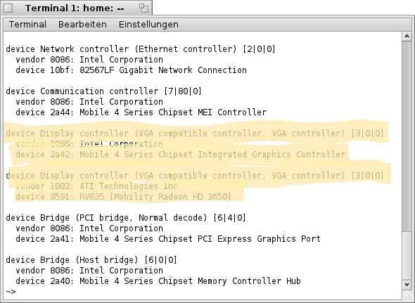 Zu diesem Zweck benötigen wir wieder ein Terminal und den Befehl "listdev". Der Befehl "listdev" gibt dabei Auskunft über alle gefundenen Devices, so auch über die Grafik- Karte(n).