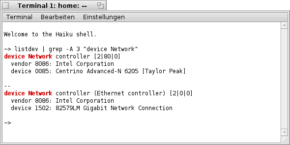 Abschließend besteht noch die Möglichkeit mit Hilfe des Befehls "listdev" herauszufinden welche Netzwerk- Karten im System vorhanden sind und von Haiku als solche erkannt wurden. Dies bedeutet jedoch nicht, dass diese auch von Haiku unterstützt werden. Nach Eingabe des Befehls