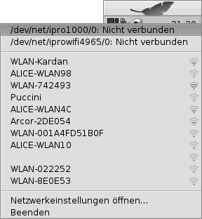 Normalerweise würde man, um sich mit einem drahtlosen Netzwerk zu verbinden, das Netzwerk- Icon in der "Deskbar" mit der Mouse anklicken. So die drahtlose Netzwerk- Karte ihren Dienst entsprechend verrichtet wird man an dieser Stelle mit einer entsprechenden Liste aller erreichbaren drahtlosen Netzwerke belohnt (siehe Bild).