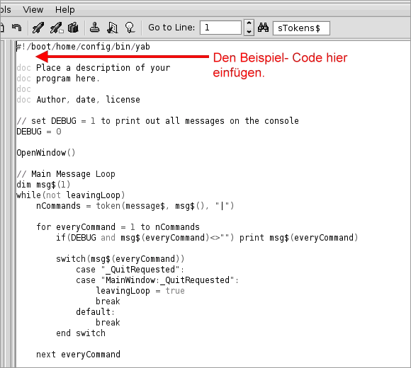Als Grundlage der unten aufgeführten Beispiele dient die "yab"- Vorlage "Basic Template". Diese wird, wie Ihr sehen könnt ein wenig modifiziert. Fügt den Quelltext an der im Bild zu sehenden Stelle ein.
