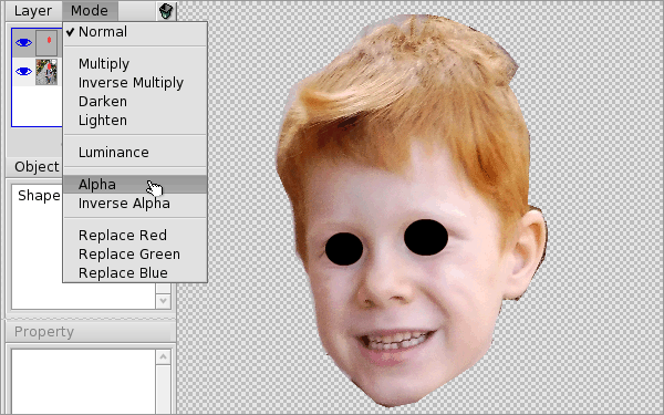 Dann wählen wir im Layer- Menü unter Mode die Modifikation Alpha. Dadurch wird die abdeckende Farbe des Shapes entfernt und man sieht den ausgeschnittenen Bildbereich.