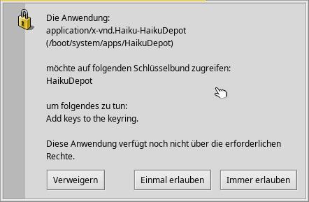 Nun musst Du noch eine Freigabe für HaikuDepot bestätigen, damit Du Zugriff auf HaikuDepot hast. Hier kannst Du entscheiden ob Du dies einmalig oder dauerhaft erlauben möchtest.