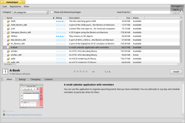 Um in HaikuDepot Pakete zu bewerten musst Du im Programm angemeldet sein. Dazu wähle im Programm-Menü, in der oberen rechten Ecke, Log in... aus.
