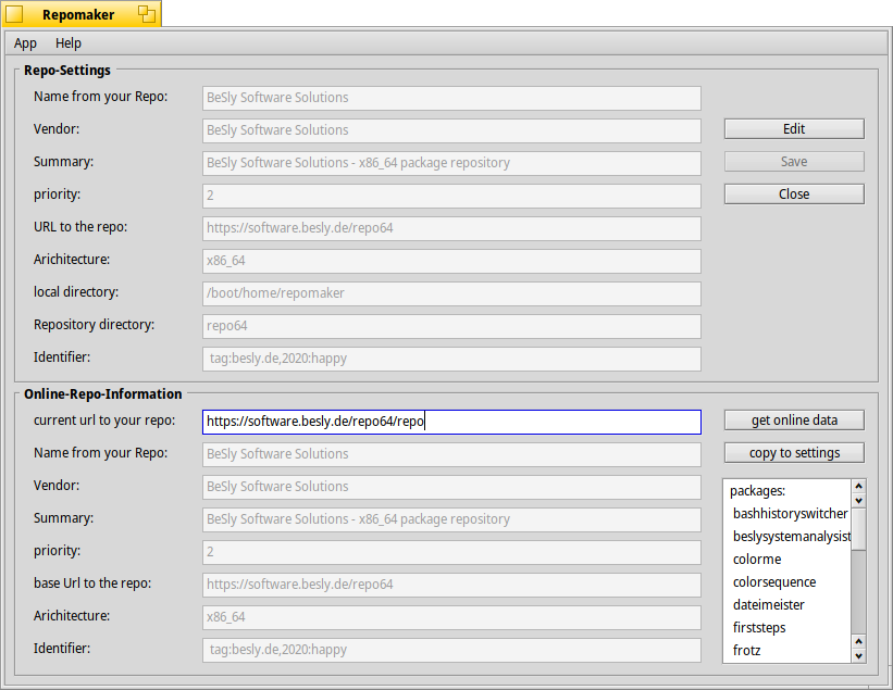 Wie in Punkt 3 schon erwähnt, haben Sie hier die Möglichkeit Ihre Repo Datei vom Webserver downzuloaden und in die Einstellungen zu überführen. Dazu benötigen Sie die Adresse zu der Repo Datei. In unserem Beispiel lautet Sie software.besly.de/repo/repo. Ihre Adresse geben Sie in current url to your repo: ein und drücken dann den Button get online data.