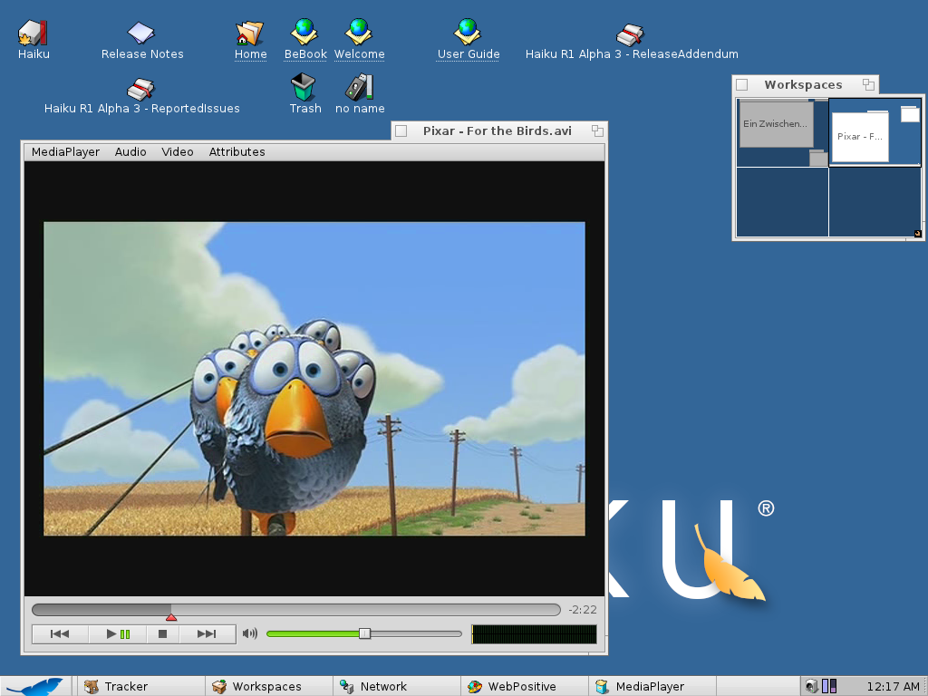 Da Haiku sich als freier Nachfolger von BeOS sieht, durften Multimediafähigkeiten nicht fehlen. Der Media-Player nutzt als Backend ffmpeg, kann damit alle gängigen Formate abspielen und ist für die Zukunft erweiterbar. Verschiedene Anwendungen lassen sich wie bekannt auf mehrere Arbeitsflächen verschieben, die sich in Haiku wiederum frei auf dem gesamten Desktop bewegen lassen.
