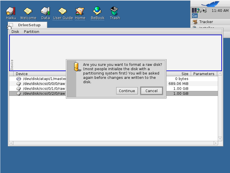 Dafür bietet Haiku das DriveSetup Programm, was sich etwa mit Gparted vergleichen lässt. Als Dateisystem kommt Be FS zum Einsatz, was wieder die Verbindung zu BeOS erahnen lässt. Zwar gibt es als weiteren Dateisystemtyp NT, aber ich würde hierbei vermuten, dass es sich wohl kaum um das NTFS Format von Microsoft handelt. Die eigentliche Installation läuft problemlos ab, die Dateien der Boot Festplatte werden lediglich samt Bootloader auf die Zielplatte kopiert.
