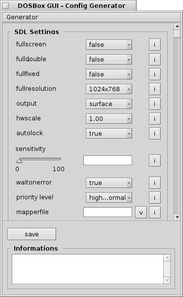 For those who have experience with DOS and the hardware of DOS times we add a config generator into the DOSBox GUI. With this generator you can create your own configuration files. To open the Config Generator select in the "Extras" menu the option "ConfigGenerator".