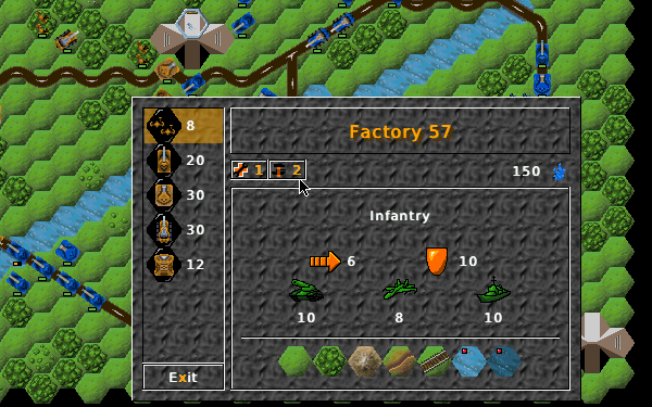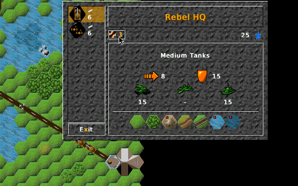 To create a new unit, press on the symbol of hammer/tank, and select a unit to produce. The new unit will be displayed in the list of units and can be used next round.