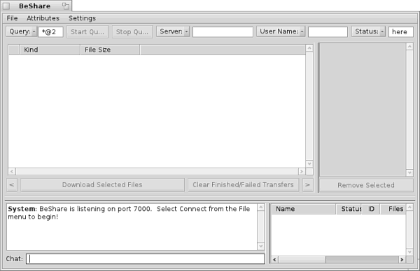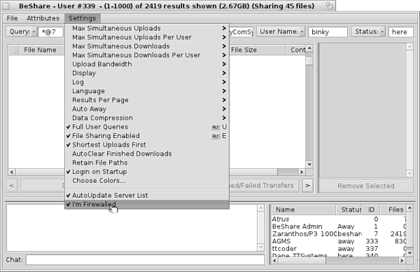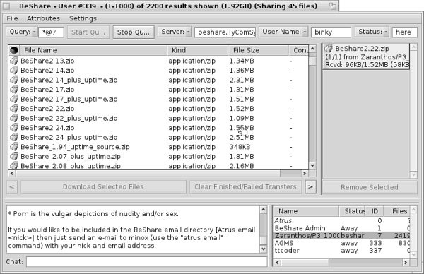 BeShare is a file sharing program based on MUSCLE for Haiku, BeOS and Zeta. In contrast to other file sharing programs, your nickname are visible for every othere people using BeShare. By selecting your nickname in the user field, other can see your shared files. Included in BeShare is a chat function, so you can talk to the other people.