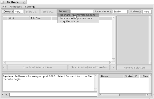Now you have to connect with a server, to do this select one of the available servers, using the drop down menu by Server. The most popular server is beshare.agmsmith.ca.