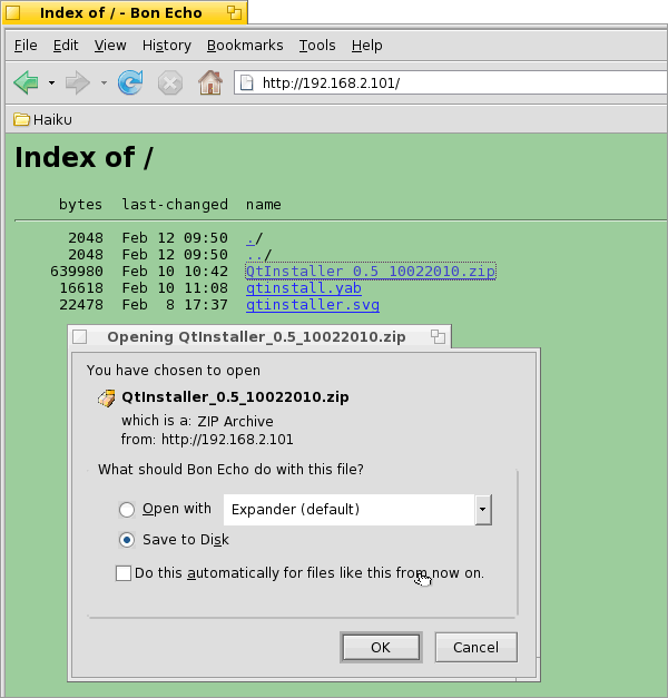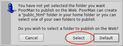 Then Poorman start up first time you need to create a shared folder for the webserver. You can create them by default (/boot/home/public_html or you can create a own one selecting over the Select button.