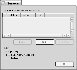 We select Change servers... in order to setup a IRC connection. You get a new window with the name Servers.