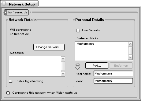 If you wish that Vision connect to the server at startup automaticly switch the checkbox at Connect to this network when Vision starts up to ON.