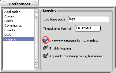 Open the "Setup" menu in the chat screen and then "Preferences". Select "Logging" in the preferences menu and activate "Show timestamps in IRC window".
