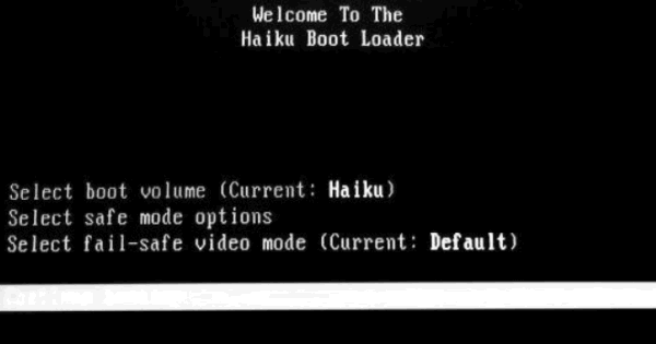 Il boot di Haiku può non riuscire sul vostro computer a causa di problemi legati al supporto del vostro hardware, alcuni di questi problemi possono essere risolti tramite il boot loader a cui si può accedere tenendo premuta la barra spaziatrice all'avvio del boot. Il menù del boot loader vi permetterà di selezionare la partizione di boot (nel caso in cui siano presenti più partizioni con Haiku installato), di attivare l'avvio in modalità protetta (safe mode) e di attivare la modalità grafica VESA, nel caso in cui nel sistema non è presente un driver per la vostra scheda grafica.