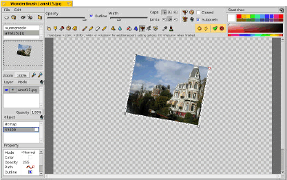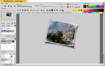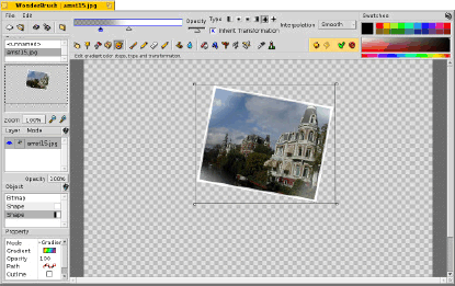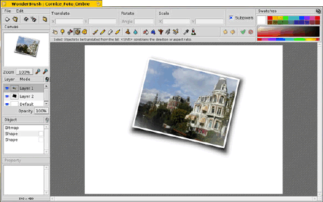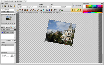 Wonderbrush crea un primo layer che contiene l'immagine da ridimensionare a piacere. Nel riquadro Object , che mostra tutti gli oggetti presenti sul layer attivo, avremo una voce Bitmap ( l'immagine appena aperta) che selezioniamo per poi inserire come valore in Rotate, Angle 10.