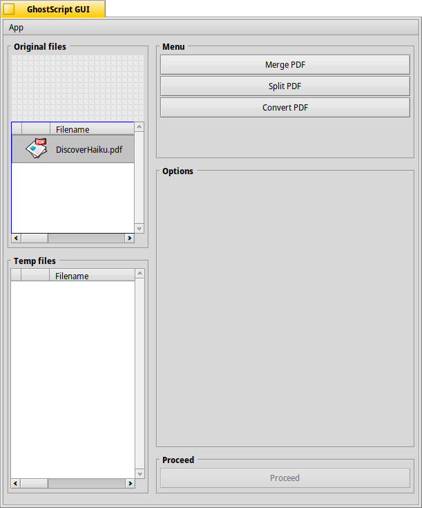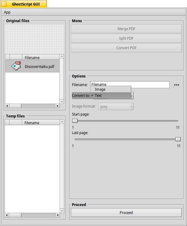 At the moment the program can only split or merge PDF files. Other functions, such as converting to postscript files, are to follow.