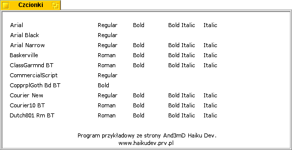 Przykładowe wyniki uruchomienia programu (lista czcionek zależy od zainstalowanych fontów):