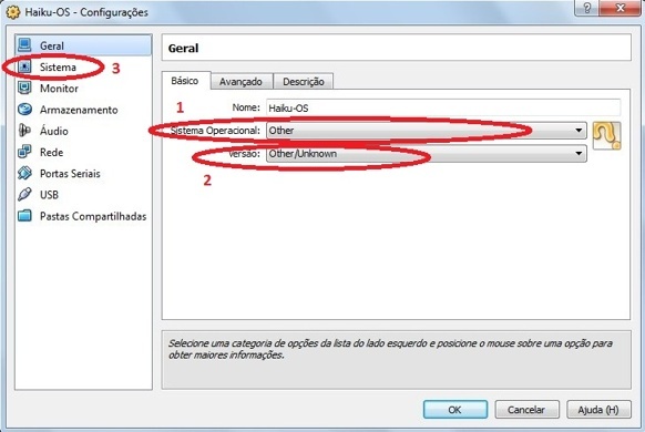Etapa 01: Primeiramente, edite as configurações da nova máquina virtual criada e escolha o sistema operacional como "Other" (1) e versão como "Other/Unknown" (2), como mostrado na imagem abaixo e depois disso clique em "Sistema" (3) para ir para a próxima etapa.