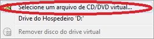 Etapa 06: Aparecerá nesse instante um pequeno menu, onde se deve clicar em "Selecione um arquivo de CD/DVD virtual" que é a opção que queremos usar.