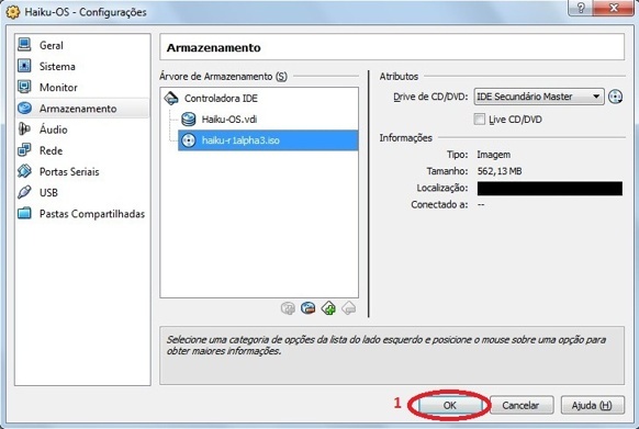Etapa 07: Note que o item "Informações" muda automaticamente para o nome da imagem selecionada, basta agora pressionar o botão OK (1) para concluir a configuração da máquina virtual.
