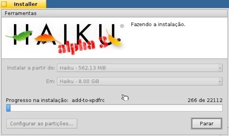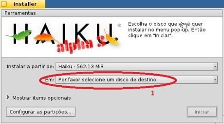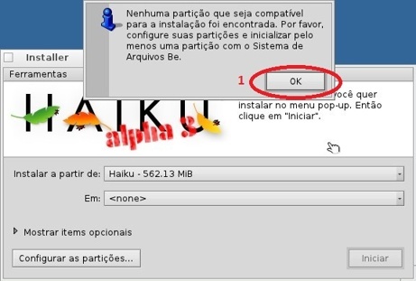 Etapa 13: Agora será preciso criar uma partição para poder instalar o sistema operacional Haiku-OS, para isso clique em "Configurar as partições..." (1).