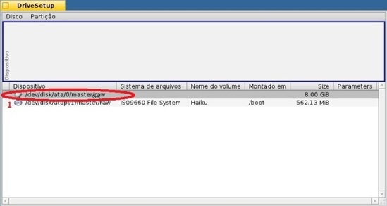 Etapa 14: O programa "DriveSetup" é executado e então clique em "/dev/disk/ata/0/master/raw" (1).