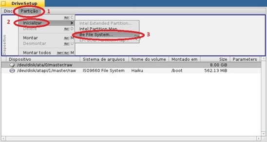 Etapa 15: Ao realizar a etapa anterior, o menu "Partição" se tornará disponível, então clique em "Partição" (1) e vá até "Inicializar" (2) e clique em "Be File System" (3). Vale lembrar que todas as operações estão sendo feitas é dentro da máquina virtual.