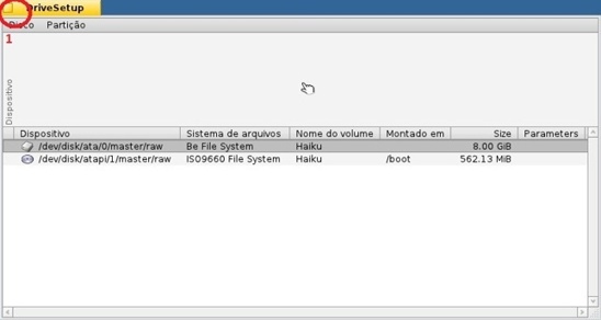 Etapa 20: Note que agora o "/dev/disk/ata/0/master/raw" está diferente do que era a algumas etapas anteriores. Clique sobre o quadrinho no canto superior esquerdo (1) para fechar o DriveSetup.