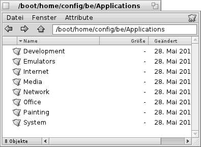 Для начала следует открыть папку, где непосредственно лежат приложения. Для этого откройте главное меню системы, и вместо выбора программы выберите непосредственно папку «Приложения»(Applications). Откроется папка с приложениями, расположенная по адресу /boot/home/config/be/Applications.