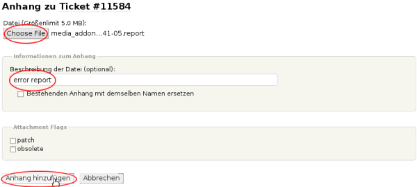 Ежели желаете добавить отчёт об ошибке, то выберите также «У меня есть файлы, относящиеся к запросу» (I have files that I would like to attach to this ticket be). |