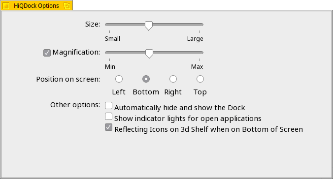 If you select an icon with the mouse and instead of left-click, right-click, a pop-up menu is opened.Dock Options… opens the HiQDock settings window
