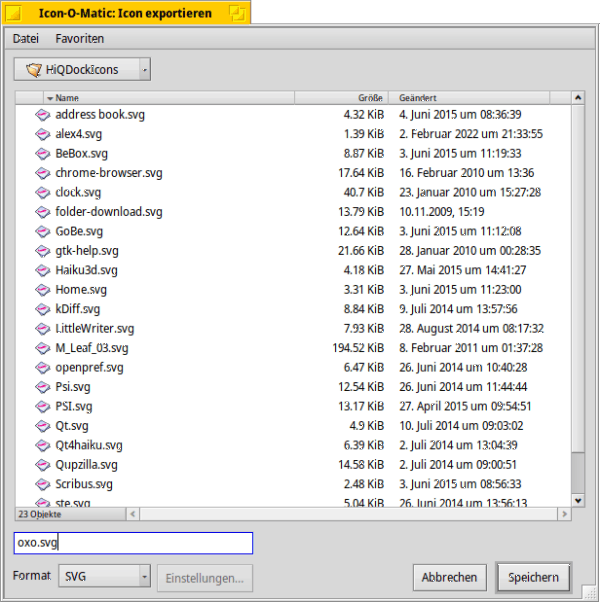 Change in the file browser to the icon directory of the HiQDock (/boot/home/config/settings/Qt/HiQDockIcons), change the format to SVG and save the icon.