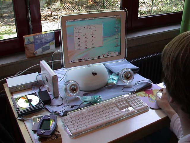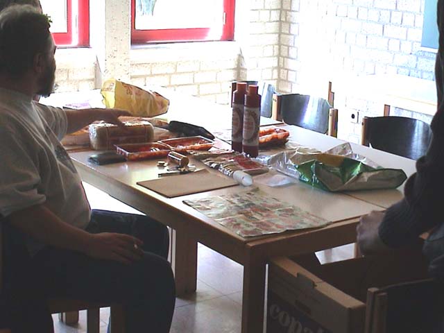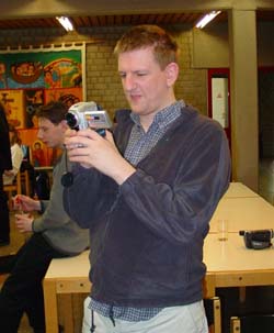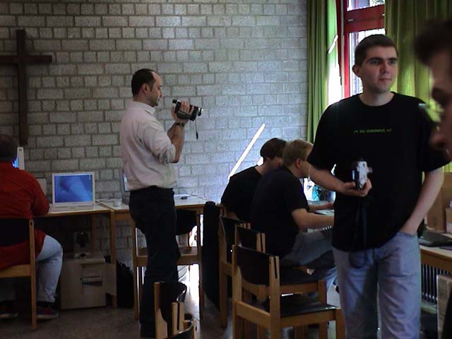 There were the usual smattering of computers sitting around along with the obligatory network. Interestingly, by far most this time most were laptops, and all but one of the rest had LCD monitors. I guess everyones got fed up lugging heavy PCs around! There was even a new iMac present (the weird looking one) and Peter kindly gave me a lesson in video editing OS X style (the iMac belongs to his wife Nadja who was also there), just plug in the camera, grab the footage and start editing, very easy. I want a Mac.