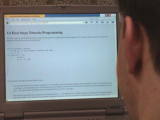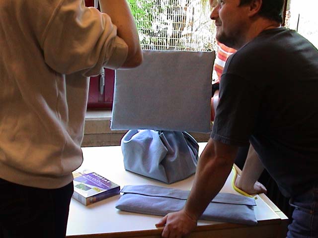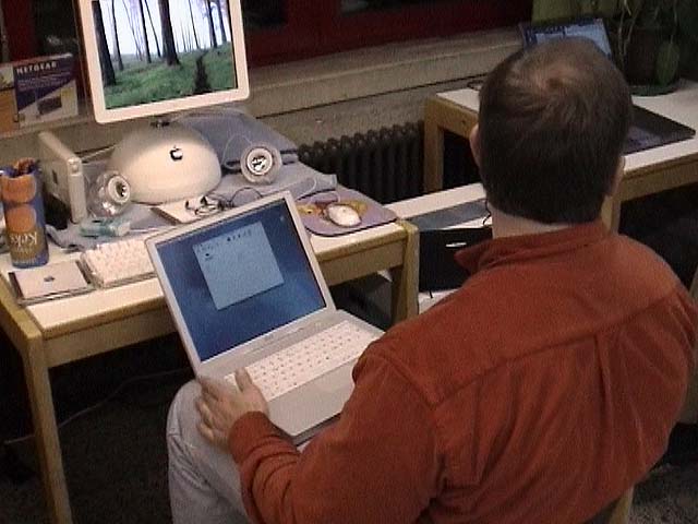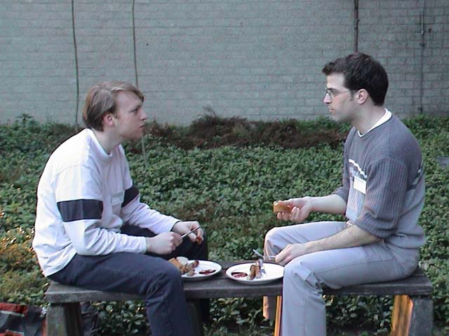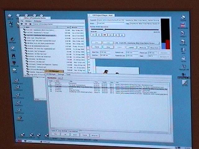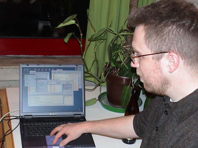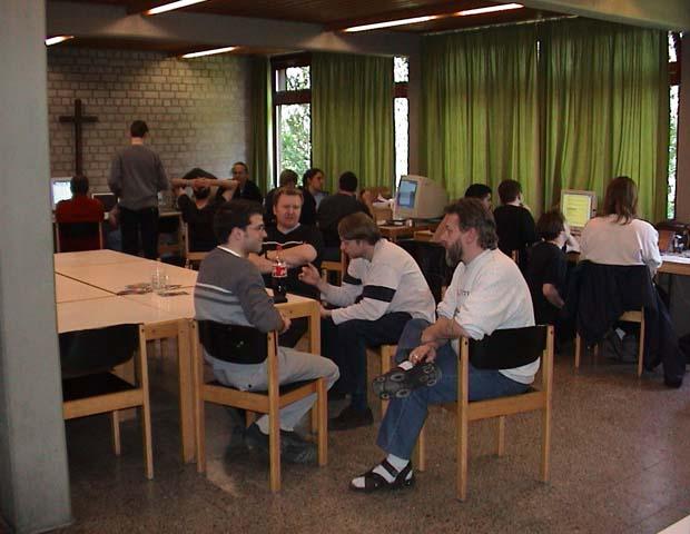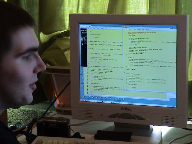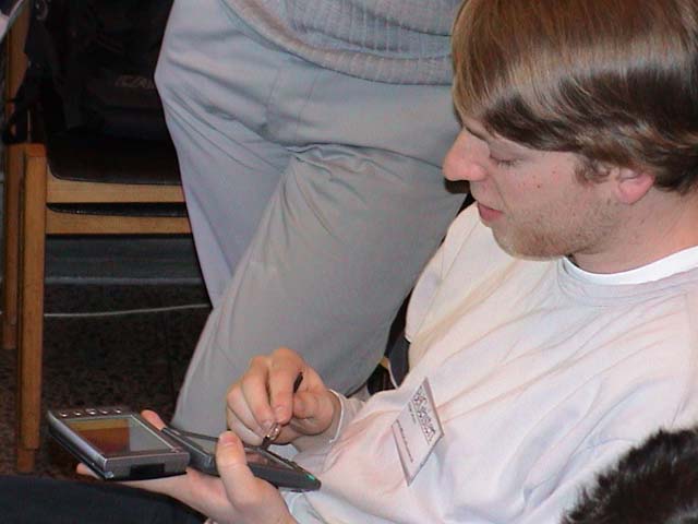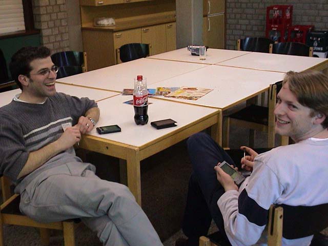 The event consisted mainly of people sitting around chatting and using their PCs. There were a few DVDs being played, cokes being drunk and even some coding - Marcus Overhagen was working on the OpenBeOS Media Kit. Many pictures and videos were taken, You'd wonder if it was a Sony user group with the number of cameras and Sony laptops around. There was even a "Future BeOS" meeting - several people had PalmsOS PDAs... Palms always appear at BeOS events and IIRC ex-Be Fearless leader JLG was in charge of the Apple Newton project and may have been involved with Palm at one point.