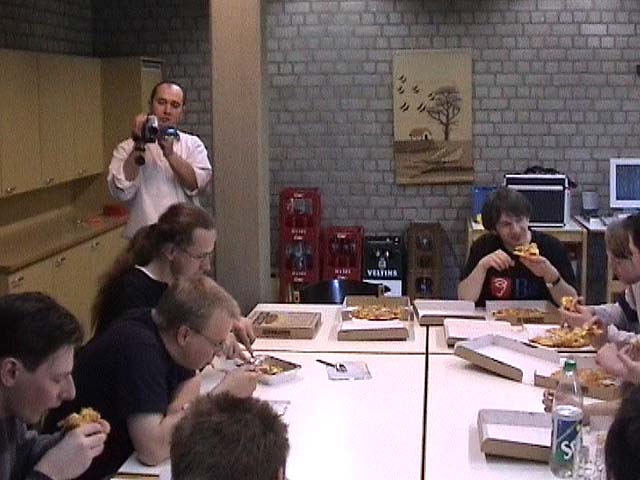 For lunch we got the usua l- what else but pizza??? Then Bernd gave us a presentation on BeOS NG. There was very recently an announcement by YellowTab (the company that Bernd runs) that they had lost their financial backing and had to abandon the project. However, there was so much work put into BeOS NG that it's going to be finished off and sold for 49 Euros a pop. Bernd is also in discussion with the OpenBeOS and Blue OS guys.