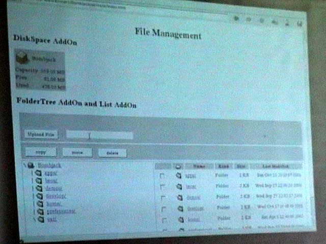 Mark Hellegers gave a demo of his FileDisk program which allows web based control of files on a BeOS system. You could do this with other systems but this allows you to access all of the attributes which BFS gives you. He couldn't really demo it properly as his presentation was given from a 32MB laptop which wont run Mozilla. It doesn't work properly with Net+ (not much does these days) but we could see the general idea as it could produce the displays.