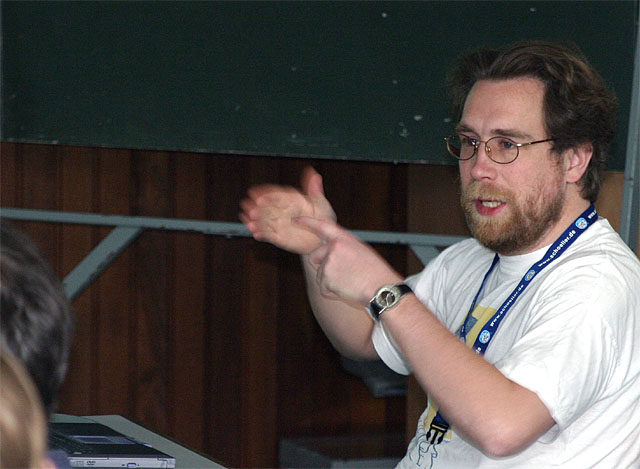 Charlie Clark gave another talk on Python, this time about how he used Python to generate PDFs which were used to produce the badges everyone wears. These were previously done in Gobe but because the main logo was an image they never came out very well due to Gobe's insistence on printing everything at 72dpi (you should print images at 300dpi or better).