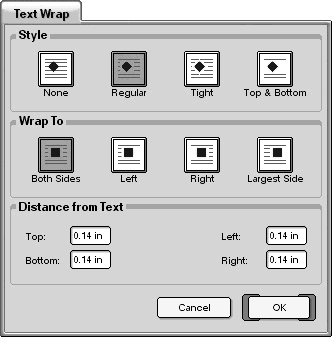 Unter Wrap to finden sich mehrere Einstellungsmöglichkeiten das Bild im Text zu positionieren. Hier kannst Du zum Beispiel den Text links und rechts am Bild vorbeifließen lassen (Both Sides) oder aber das Bild einseitig einrichten und den Restbereich freihalten.