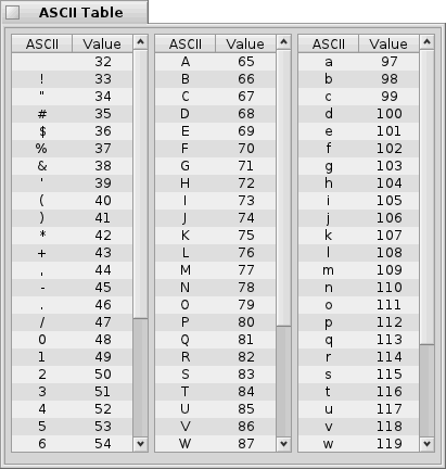 In der ASCII Tabelle sind alle Schriftzeichen enthalten, die im Editor als HEX Nummern eingegeben werden müssen, da diese reservierte Zeichen sind. Ohne die HEX Nummern kann man diese Zeichen nicht in Schriftform darstellen. Dazu gehört zum Beispiel das " Zeichen. Um es im Programm darzustellen muss man string.char (34) verwenden.