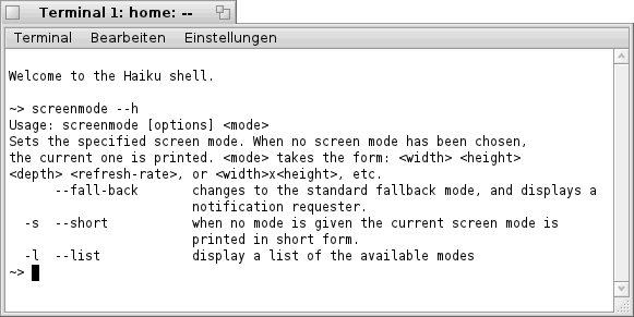 Wie ich soeben bemerkt habe, hat sich das Programm "screenmode" in den aktuelleren Haiku- Versionen etwas geändert. So sind zwei neue Optionen (-q und -m) hinzugekommen. Außerdem hat sich das Verhalten von "screenmode" ebenfalls etwas geändert.
